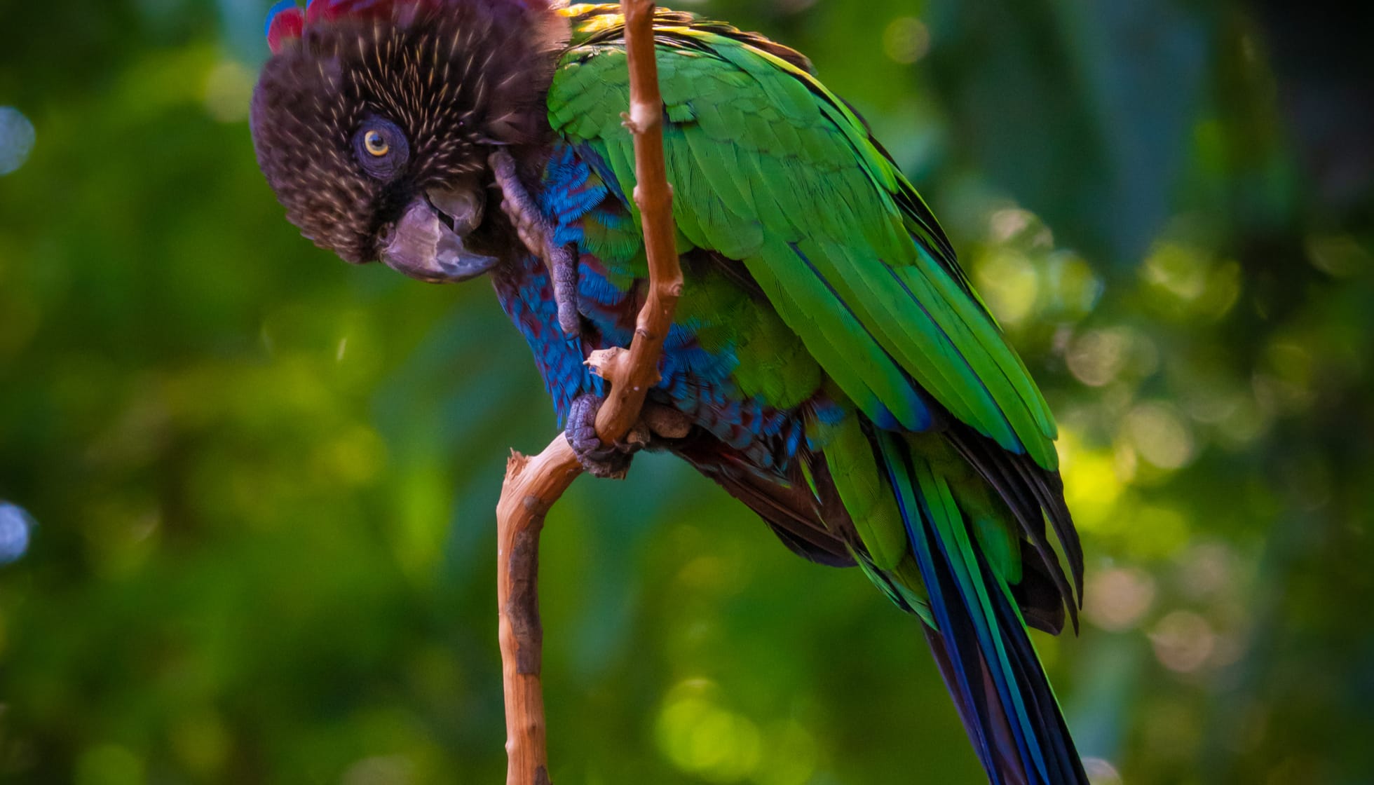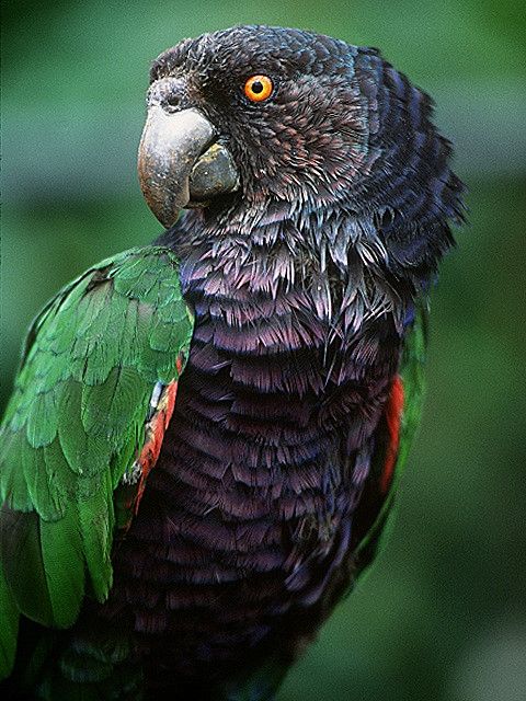 The imperial amazon measures an average of 48 cm (19 in) in length.[4] With males weighing an average of 900 g (32 oz) and females 650 g (23 oz), the species is large for its genus. Being of the family Psittacidae, the sisserou has zygodactyl feet and a thick, hooked bill with a muscular tongue. This bill is fashioned in such a way that, using its hinged mandibles and tongue, the sisserou can easily move food around in its mouth. Males and females have identical plumage: the chest is a dark shade of purple, and the upper parts and feathers are a dark shade of green, with black-edged feather tips. The eye-ring is dark brown, with the eye being a mix of orange and red. Juvenile appearance does not differ much, with a higher occurrence of green plumage and strictly brown eyes.