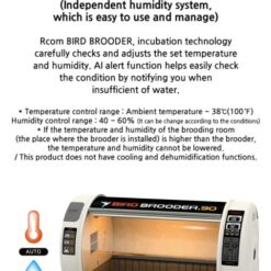 R-COM DIGITAL LARGE BROODER NURSERY MX-BS500 ICU UNIT Manufactured by the leader in digital incubators, the R-COM Bird Brooder / ICU unit is a must for every bird breeder keeping their chicks in a most sophisticated brooder. This unit will greatly enhance the ease and success rate of raising even your most sensitive species. Whether raising babies from day one or needing an ICU unit, this Brooder does it all. Automatic temperature control, humidity control, Anion supply, large tray for small to larger species. Easy to understand controls though one of the most sophisticated and advanced Bird Brooders on the market. Only a company as innovative as R-com, is able to offer you this superb unit. MAIN FUNCTION: Innovatively improve stability and durability with centralized heating system applying PTC memory element from carbon filmed heating system. Built in Antibiotic Filter / Deodorizing filter for outside air. Built in Anion activation function Water pump included for humidification Reduce up to 40% of electric power consumption compared to existing products EASY FUNCTION: Automatic Temperature / Humidity control and setting. Recessed brooding tray for easy cleaning 10 stage dimmer device for indoor illumination control Rotary Door PTC heated humidification system kills germs. Reduce of fan noise inside of brooders and provide better pleasant environment (69db) OTHER FUNCTION: BLDC Fan for optimum control of inner conditions. Elegant outer design and optimum inner space distribution Alarm function in case of abnormal temperature SIZE: This is the Medium R-Com Brooder measuring 25 3/4″ wide x 18. 5″ from front to back x 17 1/3″ high