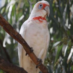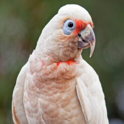 Slender-billed Cockatoos are roughly the same size as the Ducorps Cockatoo, and somewhat similar in appearance. They are funny-looking birds with crests that are too small and beaks that are too big! Even their coloring is a little funny. They are entirely white or pinkish, except for patches of orange or salmon over their eyes (which looks like a mask) and throat (which looks like a bib). They have the bare, blue patch of skin around their eyes that is typical of Cockatoos. Average Lifespan: 20 – 30 years