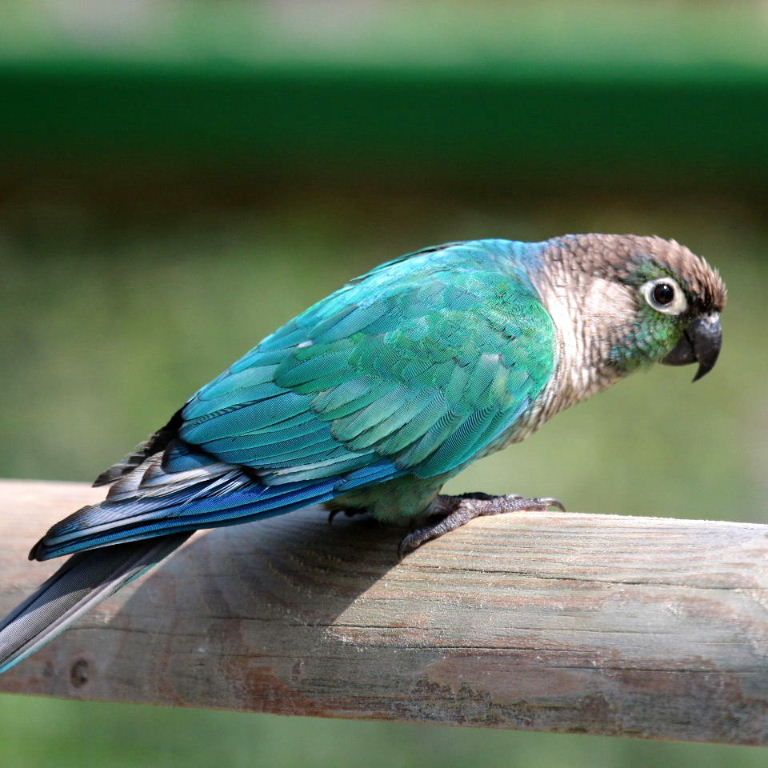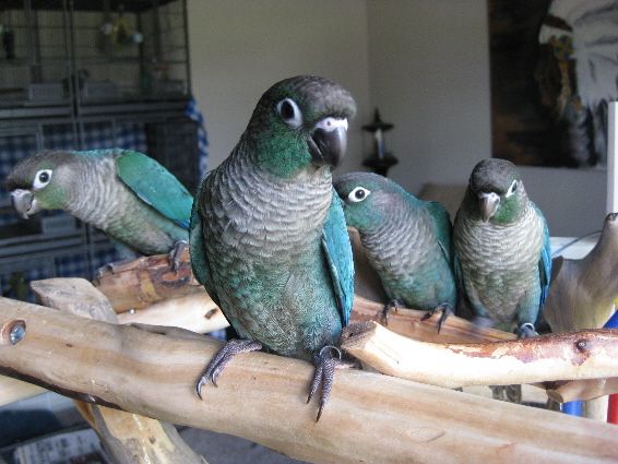 Turquoise Green Cheek Conure is native to the forests of South America. They can come in many color mutations and varieties. Green Cheek Conures are very playful, goofy, chatty and smart birds.